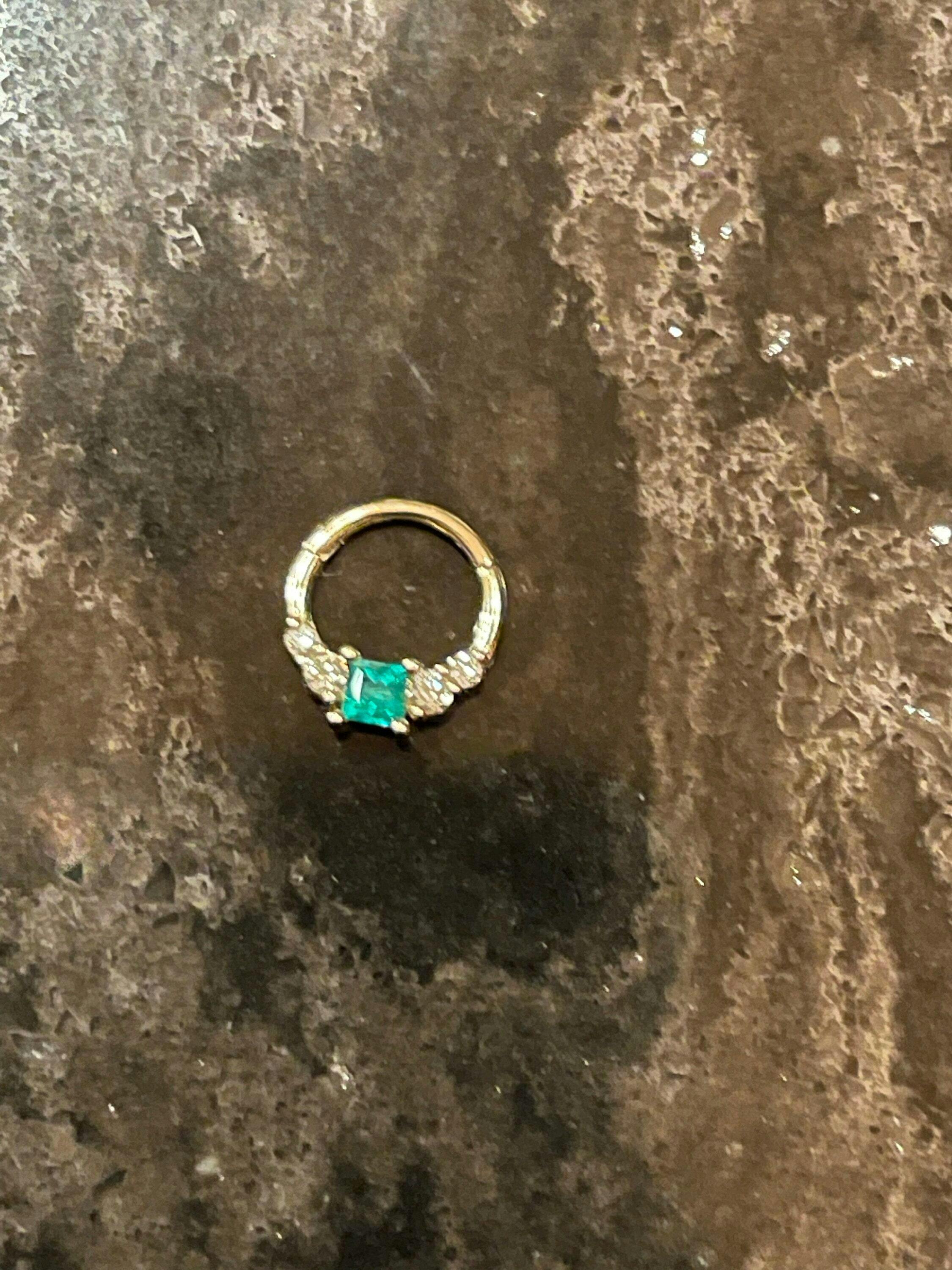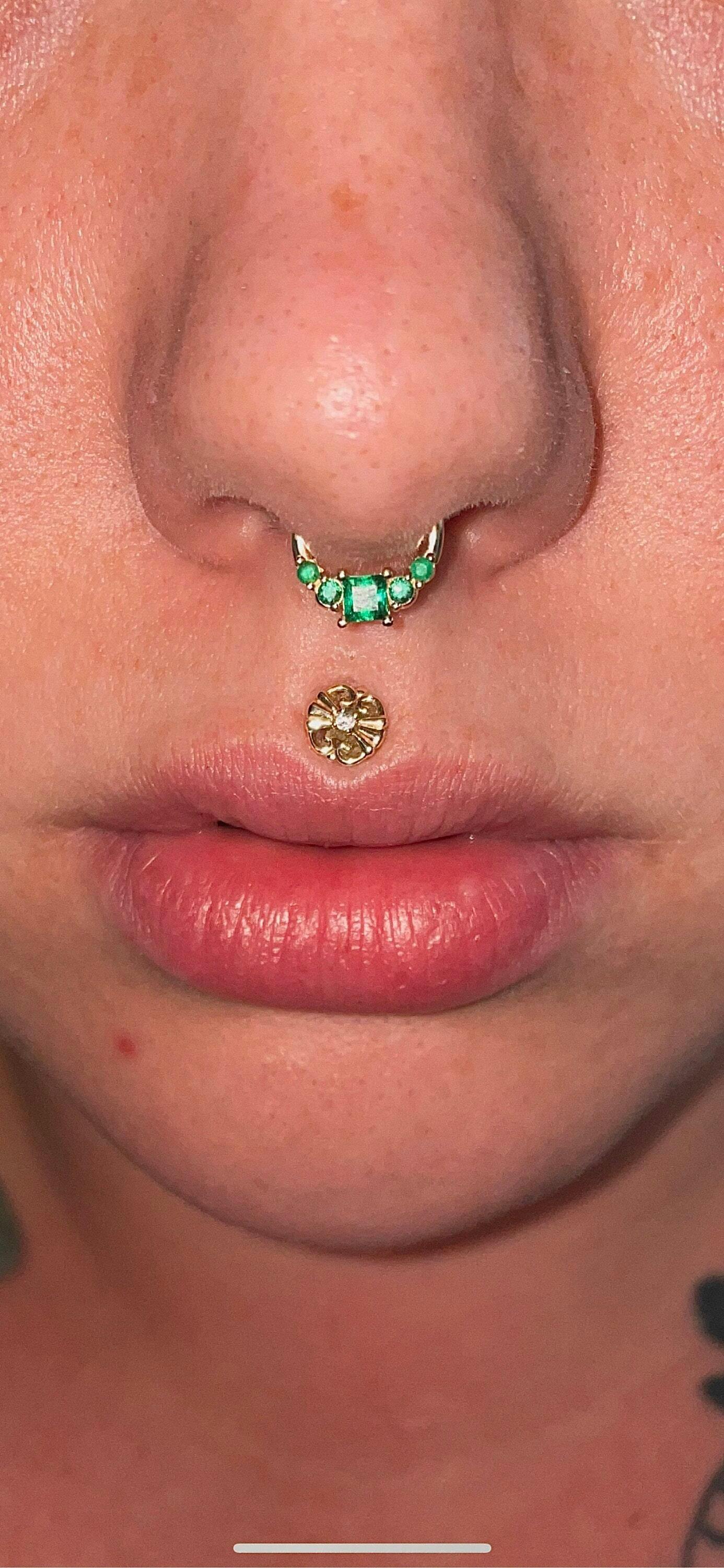 With its 14k gold construction, the emerald septum jewelry boasts a central rectangular emerald stone that is beautifully enhanced by sparkling white diamonds on either side.